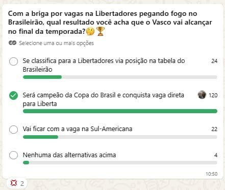 Com 120 votos, a opção mais selecionada foi que o Vasco será campeão da Copa do Brasil e assim conquistará a vaga direta para a Libertadores 2026.
